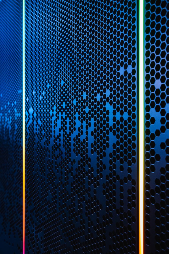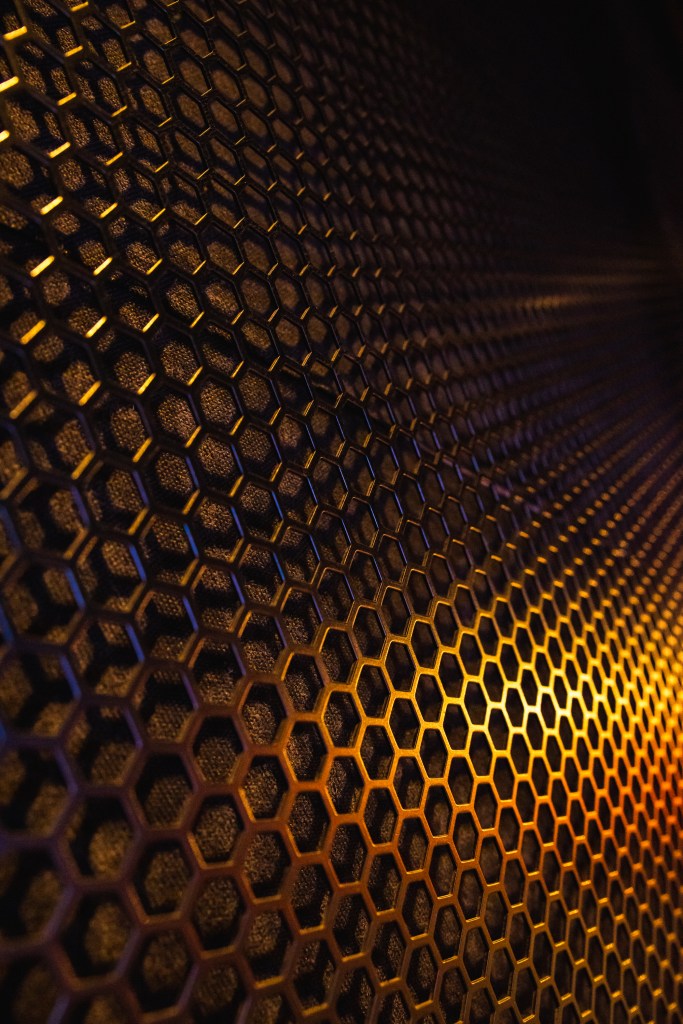 Hexagonal perforations were chosen for their excellent strength-to-open-area ratio, distributing stress more efficiently than round or square holes. With 69.5 per cent open area, the panels resolve both design ambition and acoustic performance.